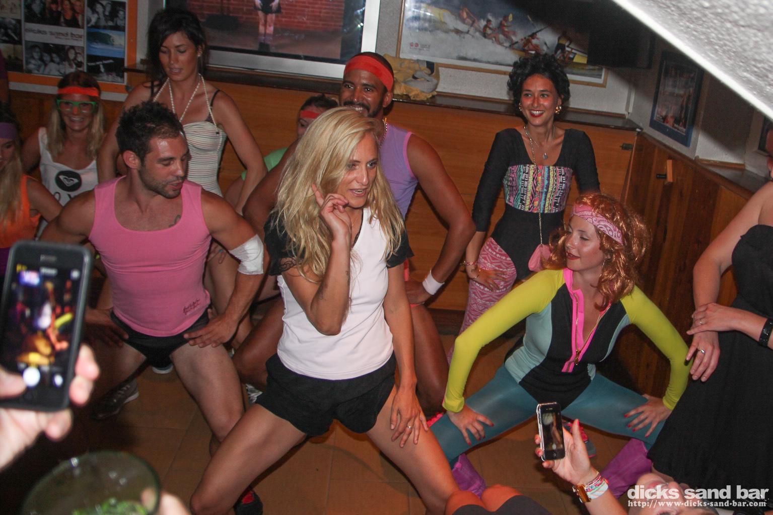 Dimitri goes back to his roots: see though underwear & womens workouts, Juliette porte des bottes de cowboy pour faire du sport, Tasha & sister show Hossegor how Val d'Isere does laybacks, Fab reste plus ou moins habiller pour tout la soiree (!!), JJ on fire, Lorena livin la vida loca, bad 80's music & good times, encore un super soiree deguisee au Dick's!