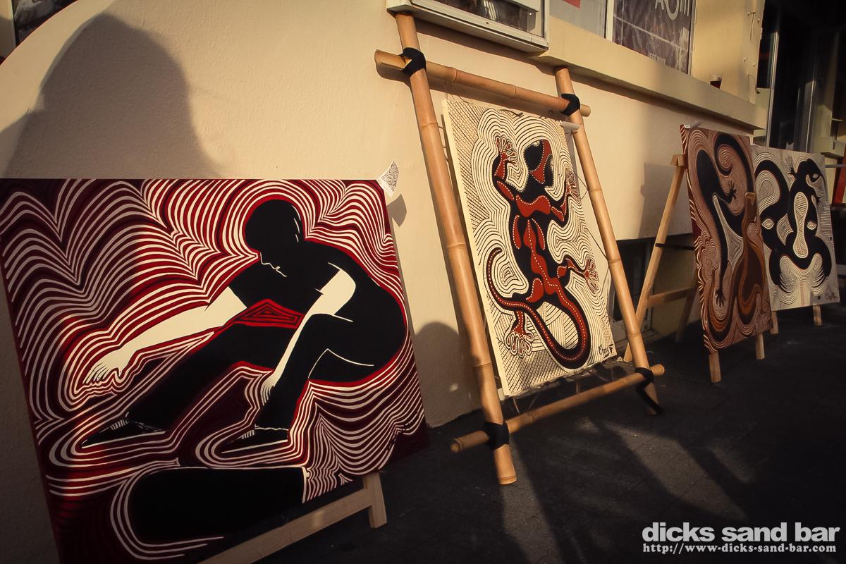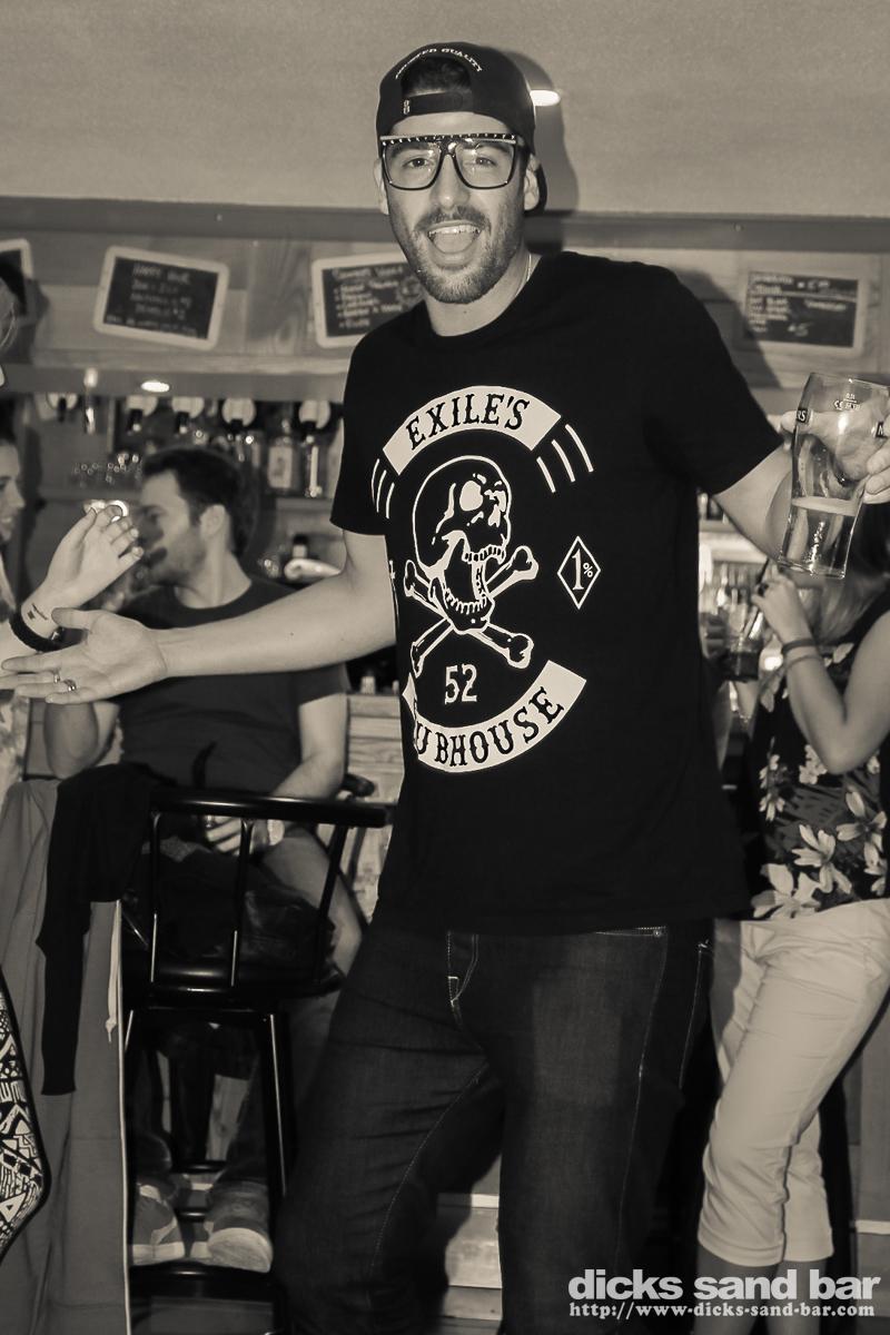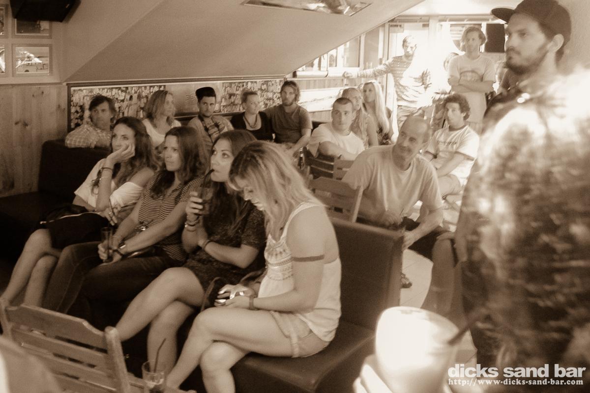 Tuesday / Mardi 2 & 3 Oct 2013..We had Christine Farr present some of her Australian inspired Art in the bar accompanied by a didgeridoo vibe which was fun. Then later Reva got all Village People with Val Hugo Boss & the crazy Swedish ladeeez, the later Margot celebrated her birthday, and her and her buddies really are crazy people, we also had a fun night with Surf / Skate photographer Steve Sherman doing a slideshow featuring his coverage of Parko's world title won at Pipe last December,and of course the ensuing party was pretty full on....photos: David Potter & Kene O' // Contact: dave@dicks-sand-bar.com